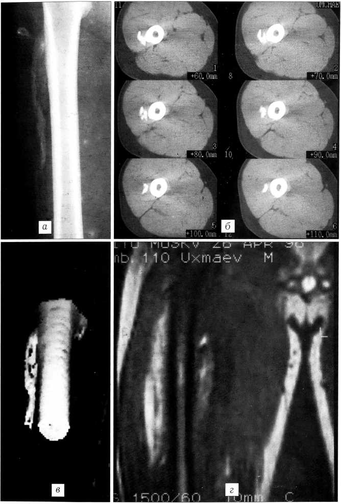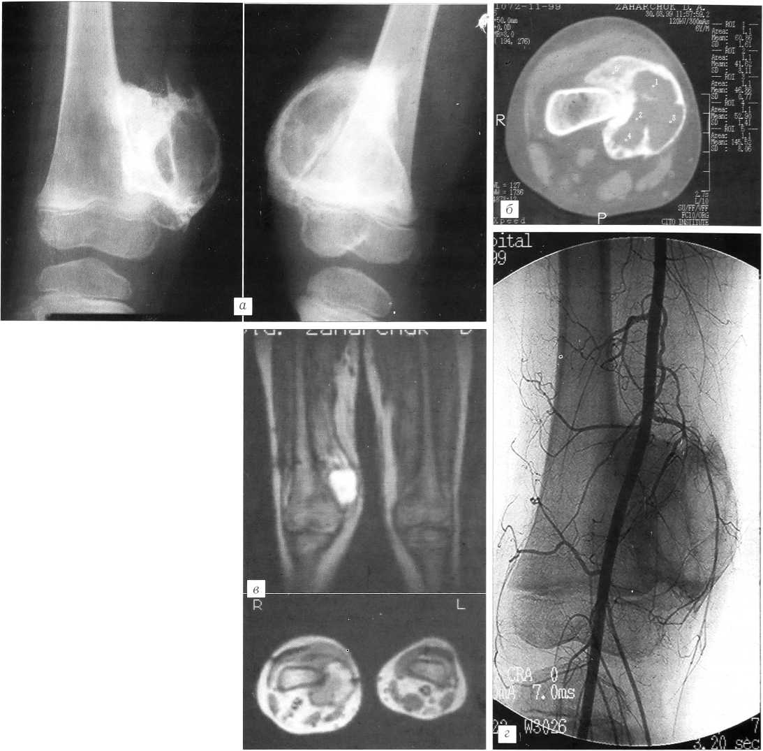 Рис. 5. Тот же больной З. через 4 мес от начала заболевания. а — рентгенограммы: большую часть оссификата занимает киста; б — компьютерная томограмма: киста имеет фестончатый контур и относительную плотность от 40 до 60 HU; в — магнитно-резонансные томограммы: в режиме Т1 взвешенности изоинтенсивный гетерогенный сигнал от оссификата. В режиме Т2 взвешенности гиперинтенсивный сигнал от оссификата и изоинтенсивный от m. vastus medialis; г — ангиограмма: смещение артериальных сосудов третьего порядка оссификатом.