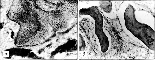Гистологическая картина. В периферических участках образования преобладают трабекулы губчатой кости, имеющие относительно зрелый характер. Новообразованная кость отличается неполноценной архитектоникой, о чем свидетельствует хаотичное расположение неравномерно созревающих костных трабекул (рис. 2, а). В последних наблюдаются немногочисленные линии склеивания, неравномерное расположение которых создает в некоторых местах картину «педжетоидной» кости. В периферических отделах образования между костными трабекулами в основном выявляются элементы жирового костного мозга, встречаются участки рыхлой соединительной ткани с малочисленными клеточными элементами — гистиоцитами и фибробластоподобными клетками. В более центральных участках элементов жирового костного мозга меньше, преобладает соединительная ткань, в которой содержится больше клеточных элементов. Имеется значительное число сосудов, особенно в более центральных участках образования, вокруг некоторых сосудов определяются гистиолимфоцитарные инфильтраты. Ближе к центру образования встречаются участки остеоидных постепенно обызвествляющихся костных балочек (рис. 2, б). Между балочками обычно располагается соединительная ткань, в которой по сравнению с периферическими участками содержится больше клеточных элементов, преимущественно фибробластов и гистиоцитов. В периферических отделах образования отмечается резорбция костных трабекул активными остеокластами.