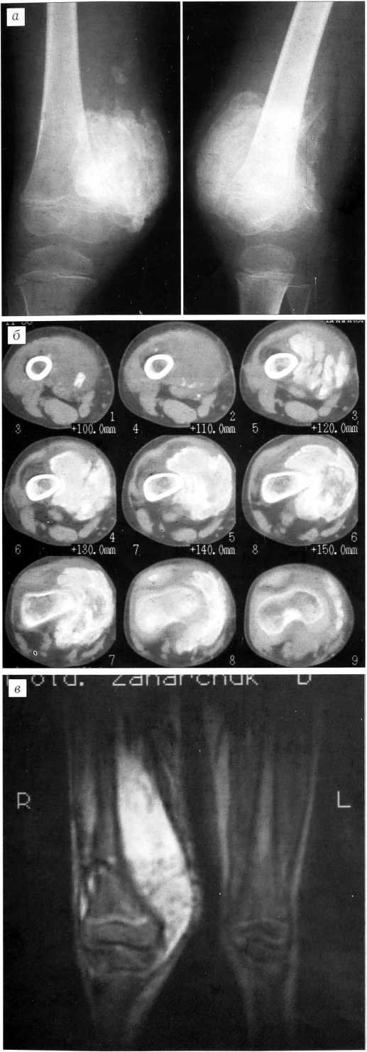 Рис. 4. Больной З. Гетеротопический оссификат правого коленного сустава. 2 мес от начала заболевания. а— рентгенограммы правого коленного сустава: неравномерная структура оссификата с участками разрежения и склероза. Четкий, неровный контур; б — компьютерные томограммы: неравномерное разрежение костной структуры в центре оссификата. Нечеткость границ между оссификатом и бедренной костью на ограниченном протяжении. Увеличение объема и нечеткость контуров m. vastus medialis; в — магнитно-резонансная томограмма: в режиме Т2 взвешенности изоинтенсивный гетерогенный сигнал от оссификата и гиперинтенсивный сигнал от m. vastus medialis.