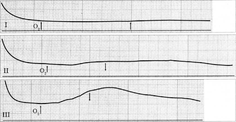 Рис. 1. Полярограммы кислородного режима кожи автономной зоны иннервации срединного нерва больного с полным анатомическим перерывом нерва (↑ — начало, ↓ — прекращение вдыхания кислорода). I— до операции (отсутствие подъема кривой при вдыхании кислорода), II— через 1 мес, III— через 3 мес после эпиневрального шва.