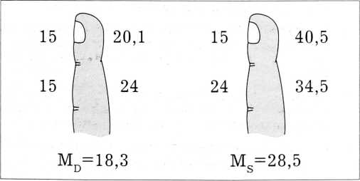 Рис. 2. Показатели микроциркуляции (ПМ) по данным лазерной допплеровской флоуметрии II пальцев стоп больного А. (MD, Ms — усредненный ПМ II пальца соответственно правой и левой стопы). MD снижен. При проведении ультразвуковой допплерографии сосудов стоп обнаружена гипоплазия первой тыльной плюсневой артерии справа, в связи с чем для микрохирургической пересадки на место отсутствующего I пальца кисти выбран II палец левой стопы. Исход операции — полное приживление пальца.