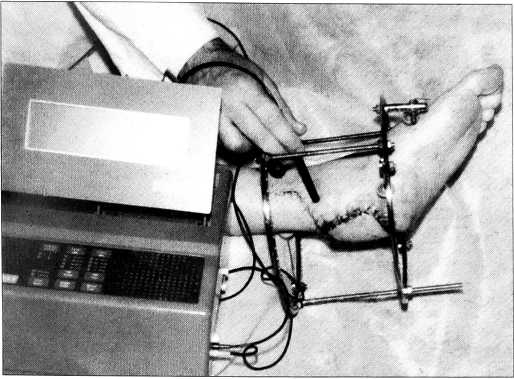 Рис. 3. Проведение ультразвуковой допплерографии сосудистой ножки свободного васкуляризованного лучевого трансплантата, пересаженного на левую стопу.