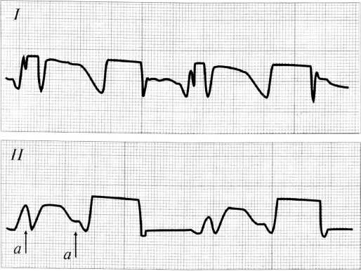 Рис. 2. Артрофонограммы коленных суставов больного Ж. 33 лет через 12 мес после травмы. I — оперированный сустав; II — симметричный сустав: определяется крепитация (а).