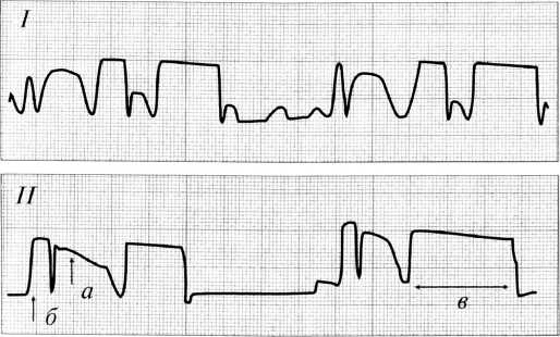 Рис. 3. Артрофонограммы коленных суставов больного И. 28 лет через 38 мес после травмы. I — оперированный сустав; II — симметричный сустав: определяются крепитация (а), щелчки (б), удлинение плато (в).