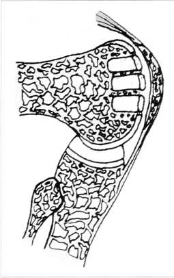 У животных 2-й группы (5 собак — 9 коленных суставов) выполняли подобную операцию, но аутотрансплантаты (n=11) использовали в сочетании со свежими костно-хрящевыми аллотрансплантатами (n=12), взятыми за 30-40 мин до пересадки и отмытыми в физиологическом растворе натрия хлорида.