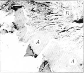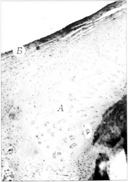 Рис. 2. Суставная поверхность аутотрансплантата (4 нед после пересадки). Гиалиновый хрящ (А) имеет обычное строение. Отмечается незначительное разволокнение основного вещества в поверхностном слое (Б). Здесь и на рис. 3 и 4: окраска гематоксилином и эозином. Ув. 240.