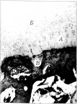 Рис. 4. Суставная поверхность области комбинированной ауто- и аллопластики (48 нед после пересадки). Хорошо интегрированные участки гиалинового (А) и фиброхряща (Б). Субхондральный слой кости восстановлен (В).