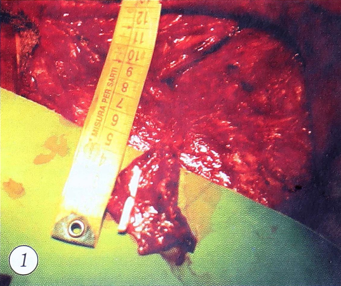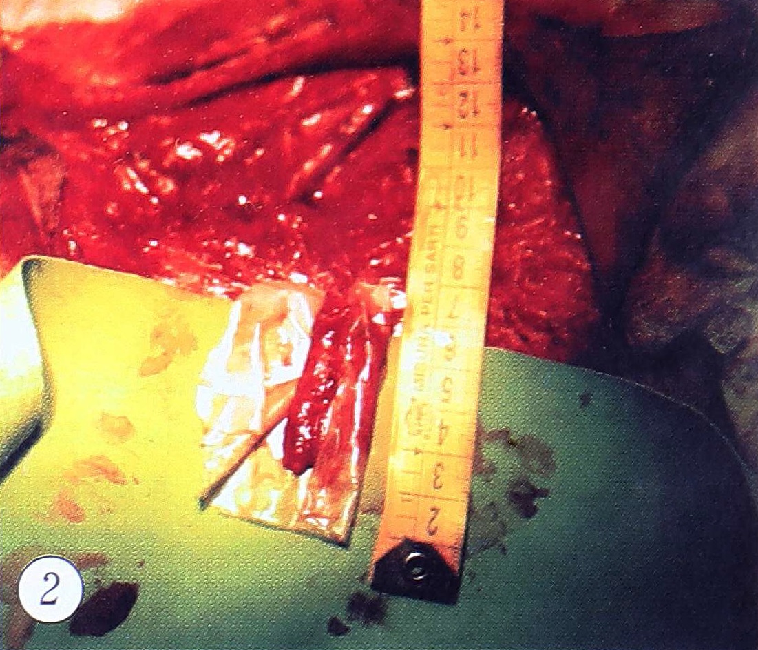 - два сухожильных трансплантата укладывались на лоскут параллельно оси питающего сосудистого пучка и параллельно друг другу. Каждое из сухожилий окутывалось ближайшим свободным краем фасциального лоскута. В результате получалось два сухожильно-фасциальных комплекса, соединенных между собой оставшейся незанятой частью фасциального лоскута, приобретавшей вид фасциальной брыжейки. Общий диаметр комплекса колебался от 8 до 10 мм.