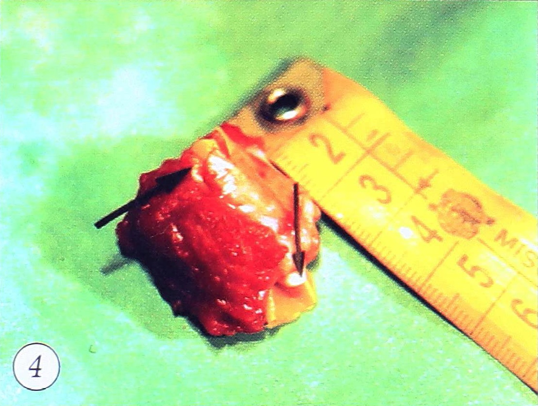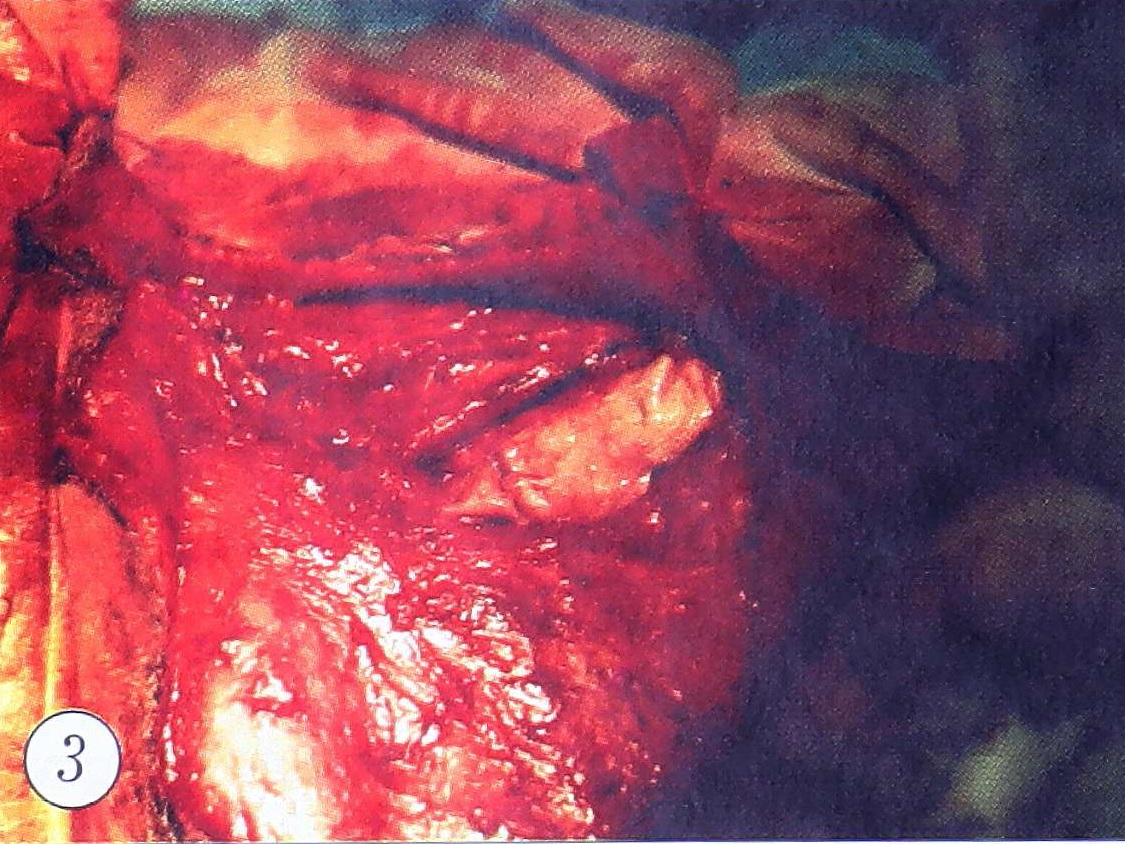Максимальные размеры свободного фасциального трансплантата из глубокой фасции бедра собаки составили 5x6 см, толщина около 1 мм. Используя при необходимости трансплантаты с обоих бедер, мы получили возможность формировать вокруг подготовленных сухожильно-фасциальных комплексов футляры из плотной оформленной соединительной ткани этих трансплантатов, лишенных кровоснабжения и иннервации (рис. 3). Таким образом достигалось моделирование состояния трофических нарушений, возникающих в пальцах на уровне костно-фиброзных каналов при застарелом сочетанном повреждении сухожилий сгибателей и пальцевых сосудисто-нервных пучков, которые характеризуются рубцовой плотностью и грубым нарушением кровоснабжения окружающих сухожильный трансплантат тканей.