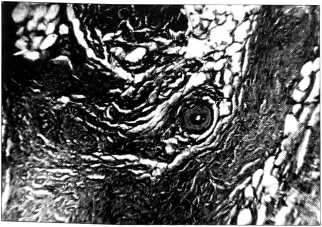 В толще фасциального лоскута воспалительная инфильтрация слабая, преобладают явления умеренного межуточного склероза, склероза сосудов.