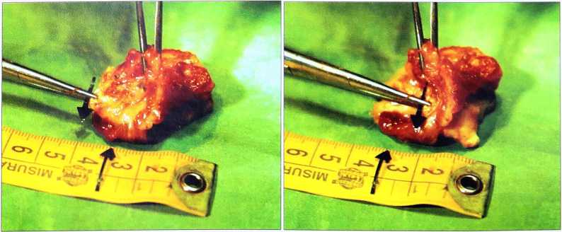 Рис. 6. Показана амплитуда осевого движения сухожильного трансплантата на 28-й день эксперимента. Макропрепарат фиксирован за мышечные ткани и стенку фиброзного канала. Перед измерением стрелки совмещены в нейтральном положении сухожильного трансплантата.