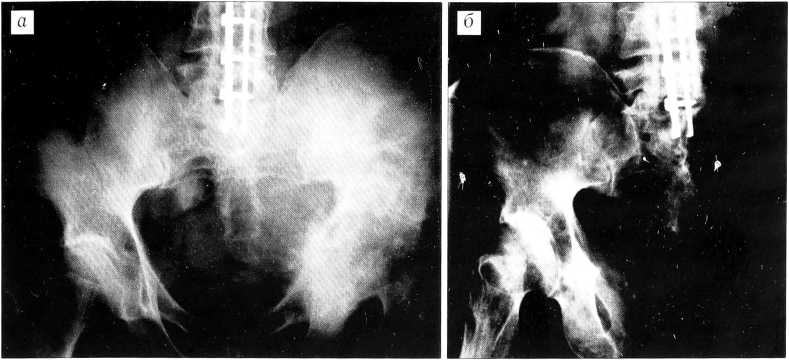 Рис. 1. Рентгенограммы больного С. Хондросаркома тела подвздошной кости. а — до операции; б — после операции.
