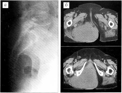 Рис. 2. Рентгенограмма (а) и компьютерная томограмма (б) больной М. Рецидив хордомы копчика.