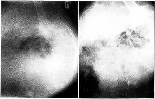 Больная Б., 56 лет, госпитализирована по поводу солитарного метастаза в проксимальном отделе левой бедренной кости с патологическим переломом (рис. 6, а). Из анамнеза известно, что в 1988 г. получала комбинированное лечение по поводу рака молочной железы, в 1990 и 1992 гг. проходила повторное лечение по поводу местных рецидивов в послеоперационном рубце. Страдает тяжелым ревматическим митрально-аортальным пороком сердца с выраженной недостаточностью кровообращения, легочной гипертензией и нарушениями ритма. Больной показано протезирование клапанов сердца, однако операция не проводилась из-за наличия онкологической патологии.
