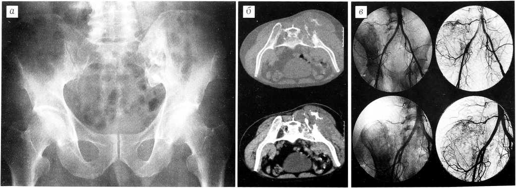 Рис. 4. Рентгенограмма (а), компьютерная томограмма (б) и ангиограмма (в) больного П. Хондросаркома таза.