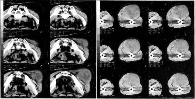 Больная М.,83 лет. В 1971 г. оперирована по поводу хордомы копчика, в 1993 г. выполнена повторная операция по поводу рецидива опухоли с проведением в послеоперационном периоде лучевой терапии. В 1997 г. госпитализирована в больницу № 62 с рецидивом опухоли. Опухоль достигала больших размеров (17x16 см), распространялась в левую ягодичную область и непосредственно предлежала к анальному отверстию. На рентгенограмме: крестец без явных костных деструктивных изменений до уровня S1-S3 (рис. 2, а). На компьютерной томограмме: по задней поверхности крестца определяется плотно прилежащее к нему мягкотканное образование протяженностью 9 см с четкими контурами (рис. 2, б). В ряде хирургических и онкологических учреждений больная была признана неоперабельной.