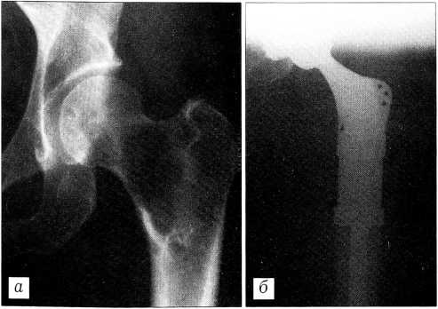 4.11.98 выполнена резекция проксимального суставного конца бедренной кости с эндопротезированием (рис. 6, б). Операция и послеоперационный период прошли без осложнений. Через 3 мес больная оперирована в кардиохирургическом стационаре, где произведено протезирование клапанов. Через 1,5 года после операции чувствует себя хорошо, работает по специальности. Таким образом, для этой больной были решены две задачи — продление жизни и улучшение ее качества.