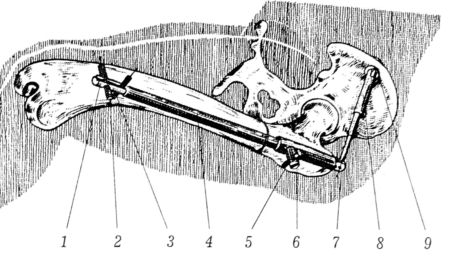 Аппарат (рис. 1) состоит из внутреннего корпуса 1 с блокирующими винтами 2 и 3 для фиксации дистального фрагмента бедренной кости. Корпус 1 взаимодействует с наружным корпусом 4, снабженным блокирующими винтами 5 и 6 для фиксации проксимального костного фрагмента. Внутри корпуса 4 находятся ходовой винт и храповой механизм с головкой 7, которая соединена с телескопическим приводом 8 и винтом 9 для фиксации конца привода 8 к крылу подвздошной кости. При ротационных движениях бедра храповой механизм обеспечивает выдвижение корпуса 1 из корпуса 4 и дозированную дистракцию костных фрагментов.