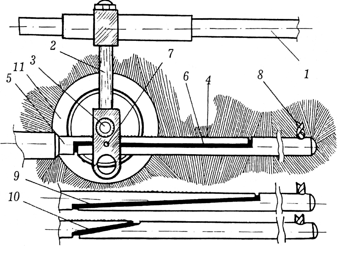 Сразу после просверливания костномозгового канала мы получаем возможность выполнять различные остеотомии со стороны канала. Это обеспечивается фрезерным аппаратом (рис. 4), который устанавливается на штангу 1 кондукторного аппарата. Стойка 2 имеет отверстие для зубчатого колеса 3, взаимодействующего с зубцами 4 корпуса 5 с копиром 6, внутри которого перемещается выступ 7, заставляющий фрезу 8 проходить внутри кости путь, точно соответствующий копиру 6 (или 9, или 10). Поступательное движение корпуса 5 осуществляется маховиком 11. Вращающаяся пальчиковая фреза фрезерует стенки кости изнутри и прорезывает их (рис. 5).