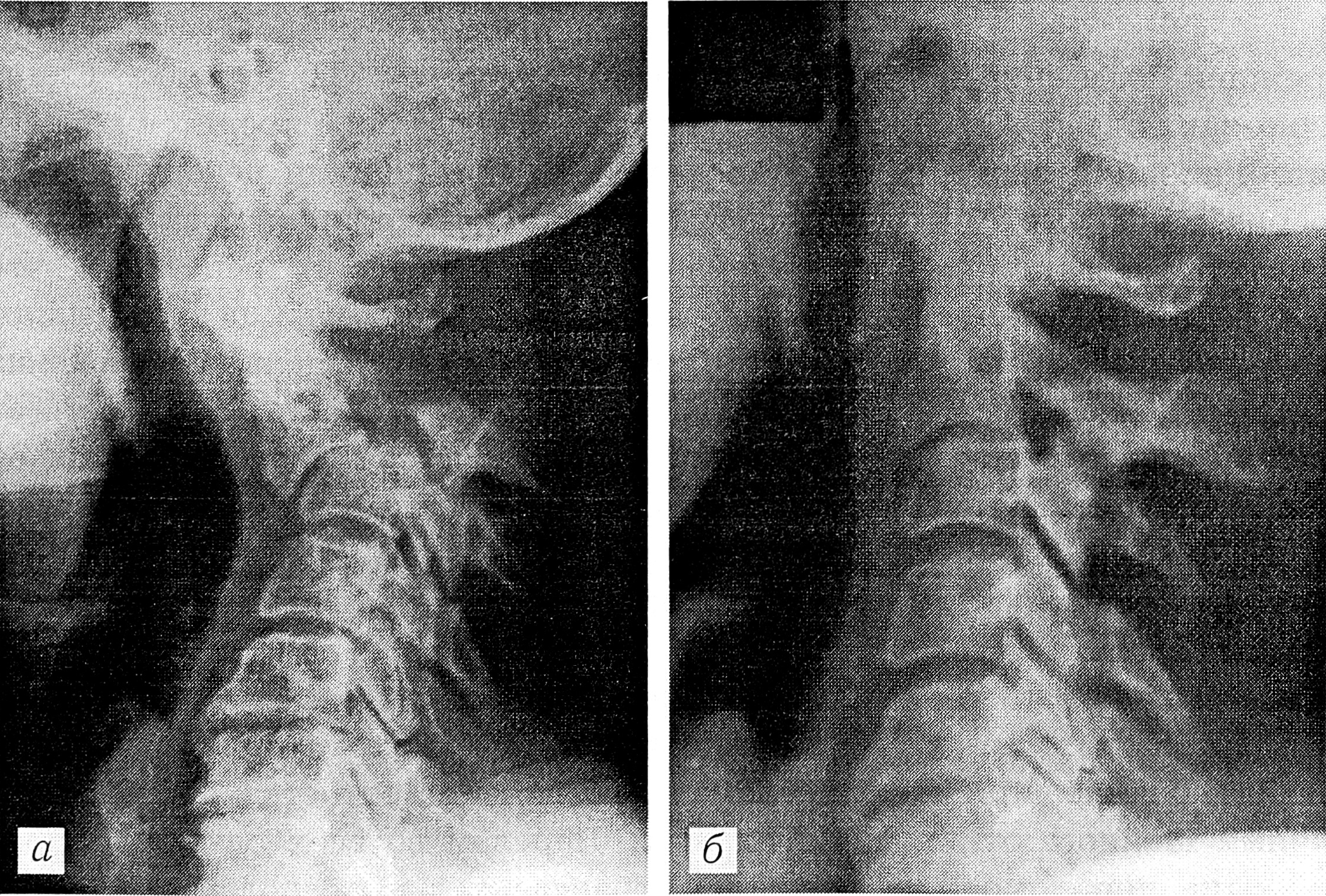 Больная Г., 39 лет, поступила с жалобами на боли и ограничение движений в шейном отделе позвоночника. За 2 мес до того была сбита машиной. Находилась на лечении в нейрохирургическом отделении с диагнозом сотрясения головного мозга. После купирования явлений сотрясения сохранились боли и ограничение движений в шее. Больная была направлена на консультацию в ЦИТО.