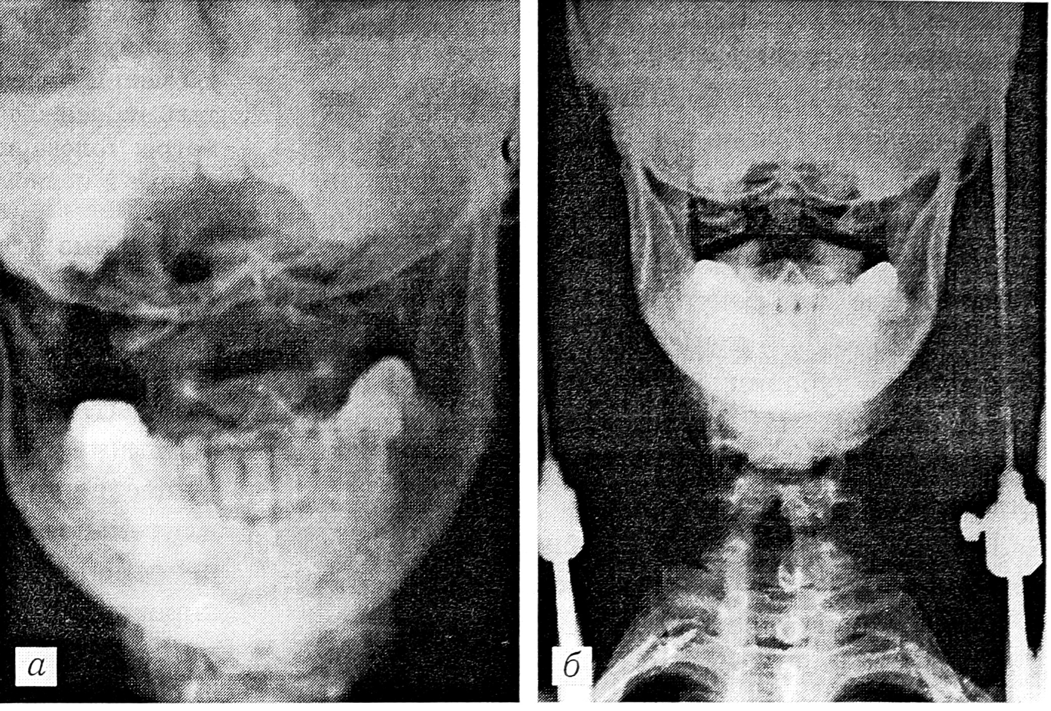 а — на снимке, сделанном через рот, определяется перелом Джефферсона, видно расхождение боковых масс атланта, суставные щели боковых атлантоаксиальных суставов не дифференцируются; б — за счет тракции в гало-аппарате достигнута репозиция отломков: расхождение боковых масс атланта уменьшилось, хорошо определяются боковые атлантоаксиальные суставы.