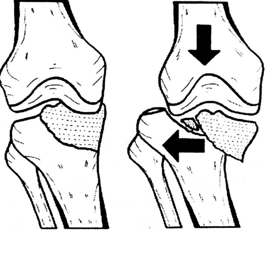 Механогенез перелома мыщелка с подвывихом или вывихом голени представляется следующим. При падении с высоты на выпрямленные ноги или падении на дороге от наезда автотранспорта происходит отведение голени кнаружи и увеличение физиологического вальгусного угла в коленном суставе. Острый край латерального мыщелка бедра воздействует с травмирующей силой, направленной кнутри и вниз, и откалывает медиальный мыщелок большеберцовой кости вместе с межмыщелковым возвышением. Латеральный мыщелок бедра внедряется в губчатую ткань эпиметафиза большеберцовой кости и смещает кнаружи ее латеральный мыщелок с диафизом (рис. 1). При этом крестообразные связки коленного сустава не повреждаются, так как линия перелома проходит через латеральный мыщелок большеберцовой кости перед местом их прикрепления к переднему и заднему межмыщелковому полю.