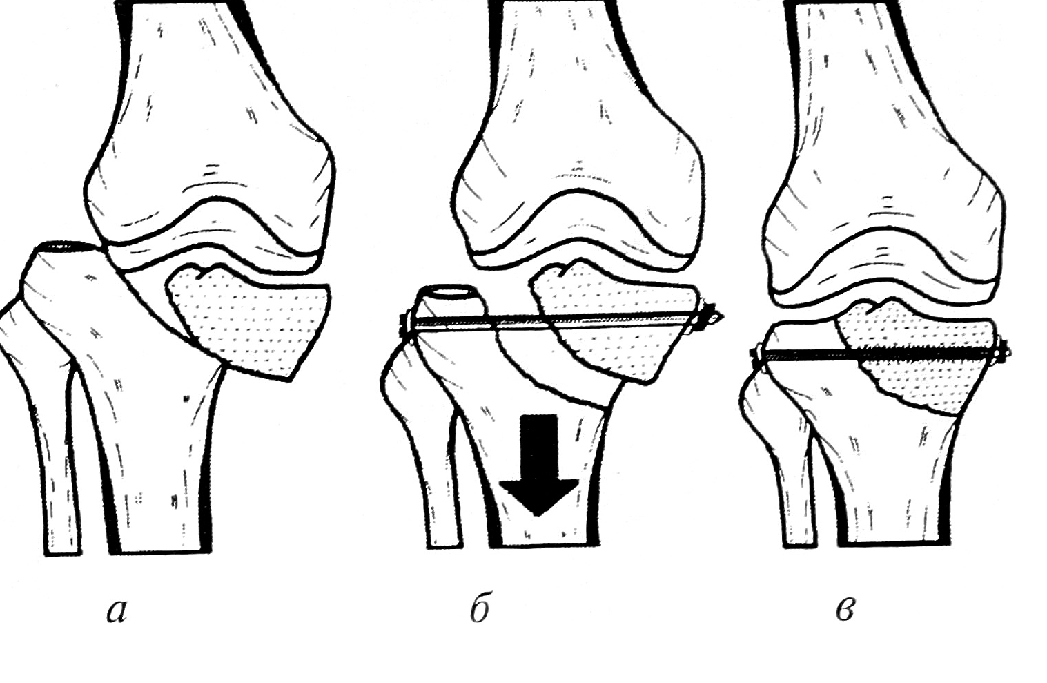 Рис. 2. Схема репозиции латерального мыщелка большеберцовой кости и устранения вывиха голени. a — перелом медиального мыщелка и вывих голени кнаружи; б — тракция по длине на ортопедическом столе, восстановление суставной щели, проведение болта-стяжки; в — устранение вывиха голени.