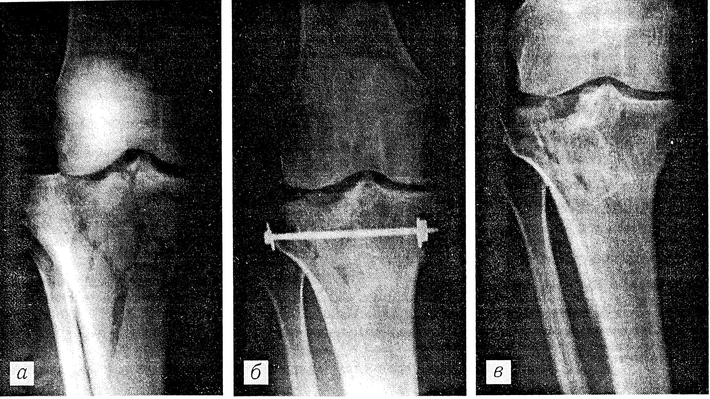 Рис. 3. Рентгенограммы коленного сустава больного В. a — положение отломков при поступлении; б — устранение смещения отломков и вправление подвывиха с помощью болта-стяжки; в — через 8 лет после операции.