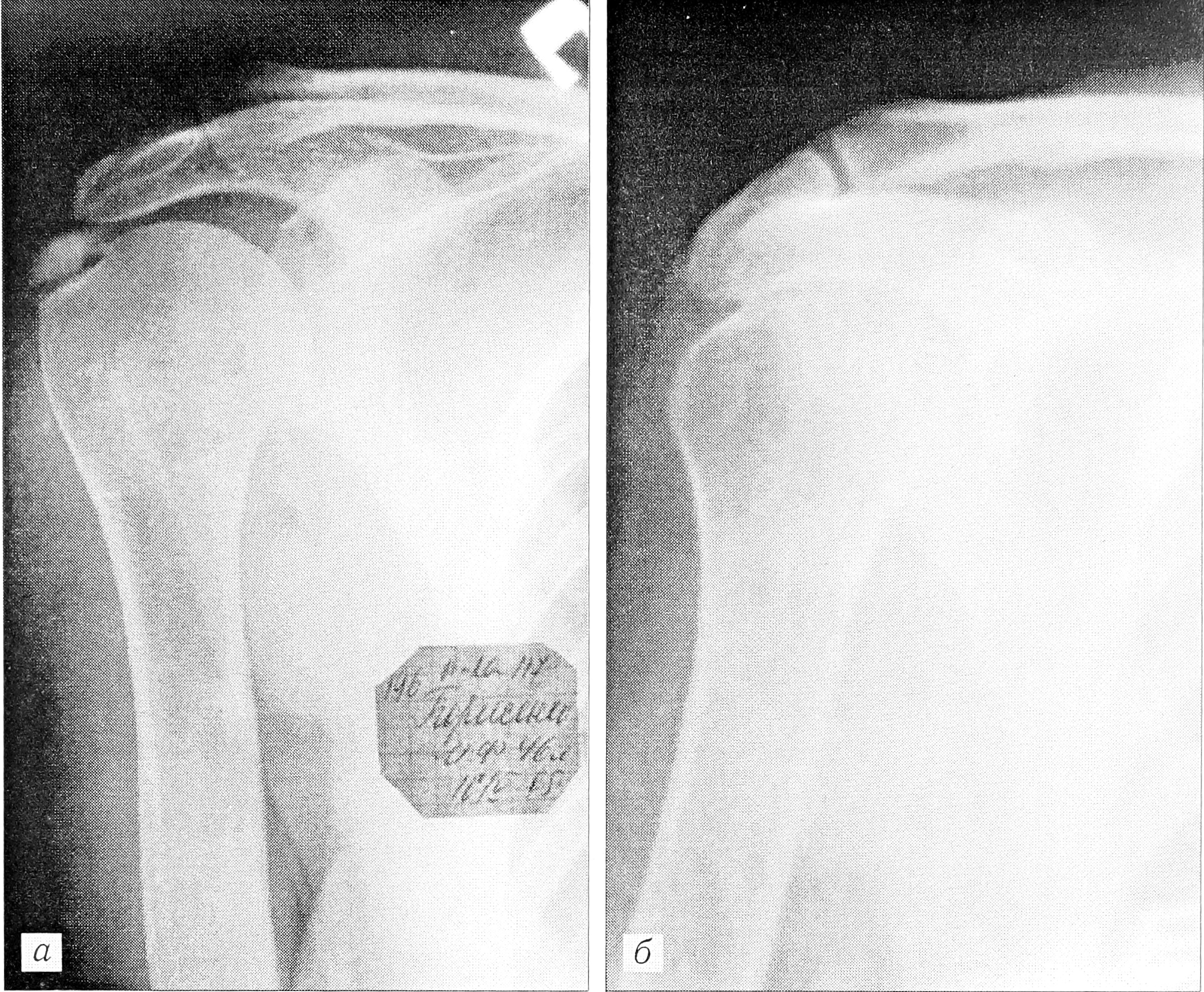 а — до лечения; б —после курса лазеротерапии: рассасывание оссификата капсулы плечевого сустава.