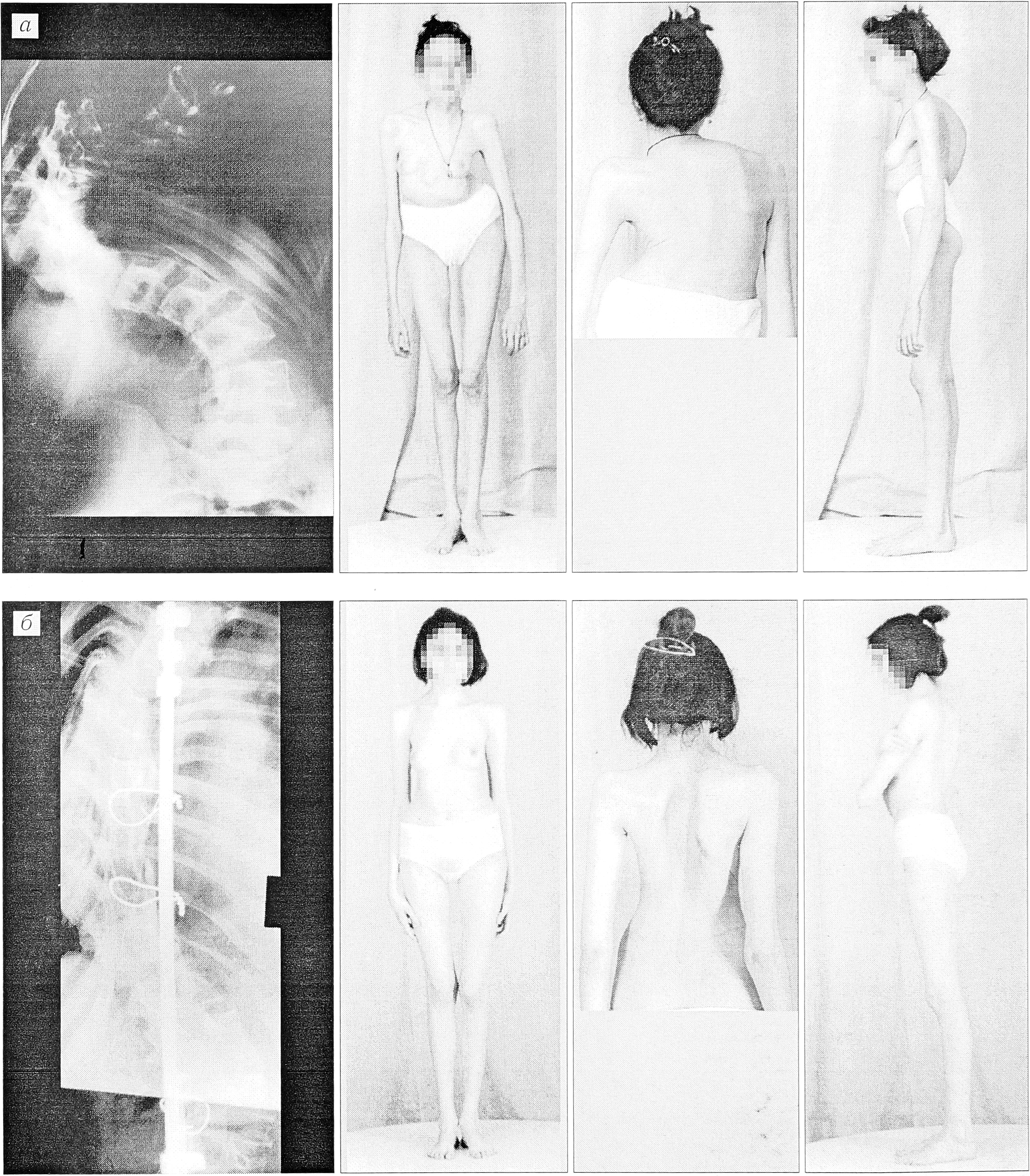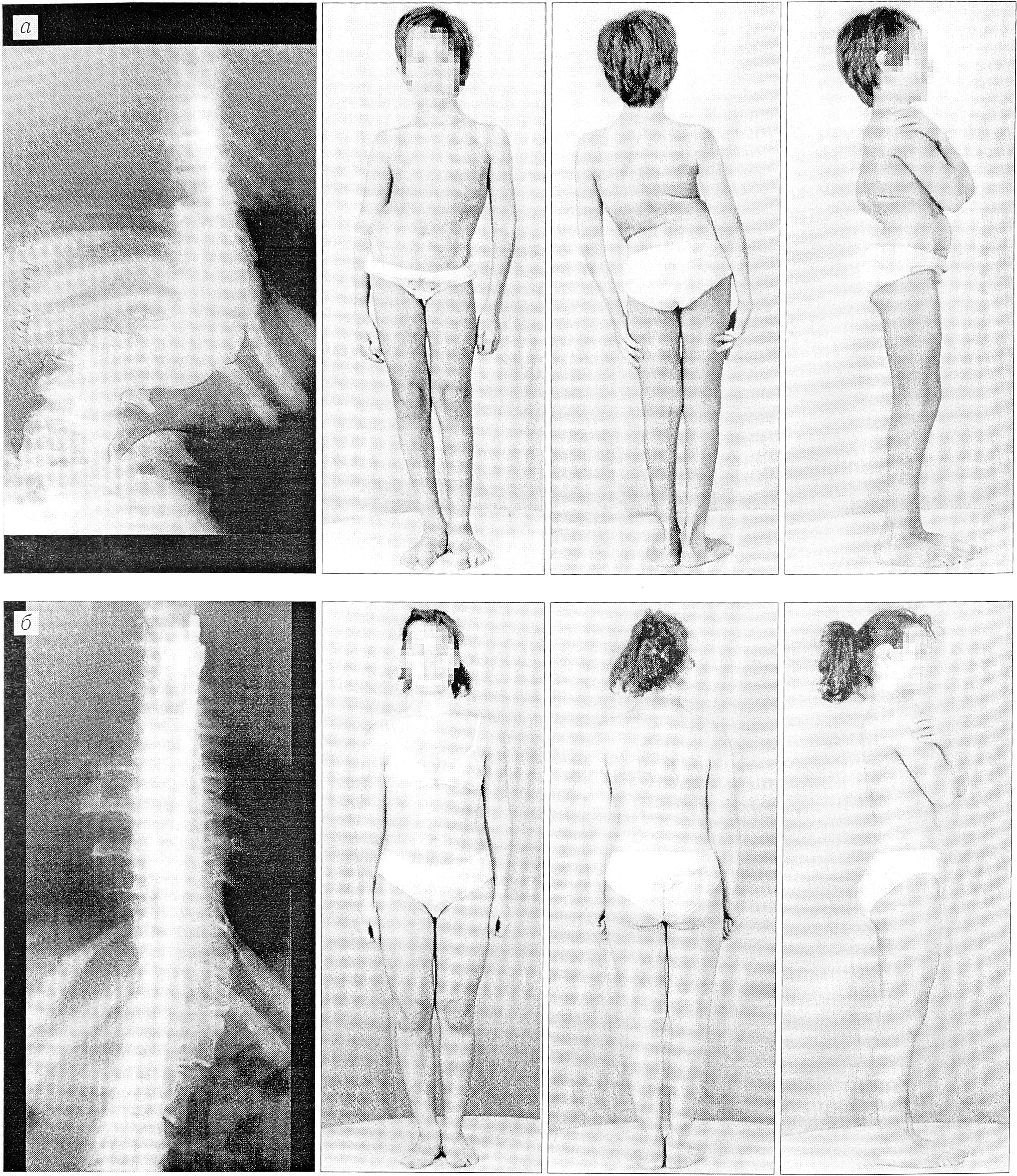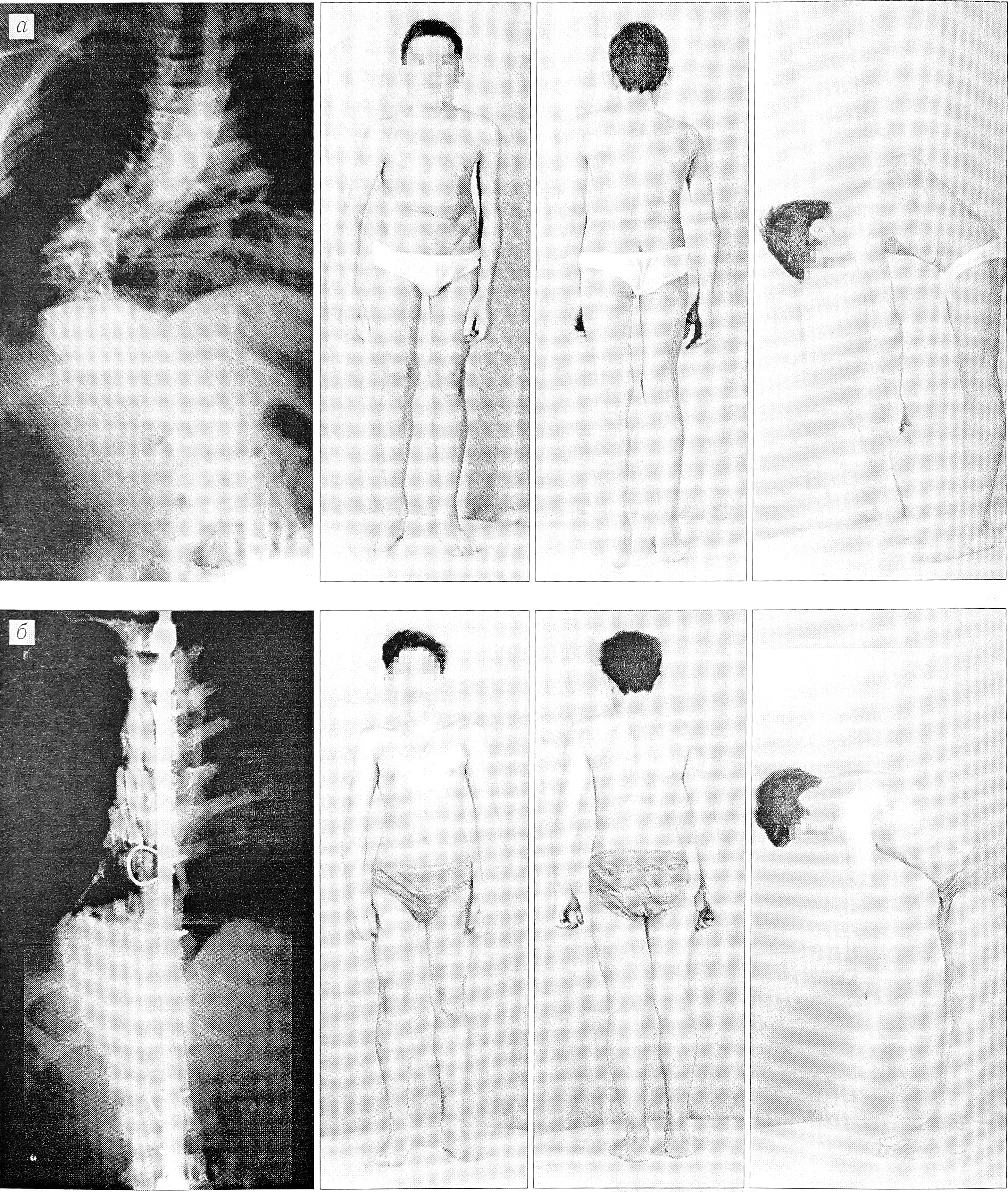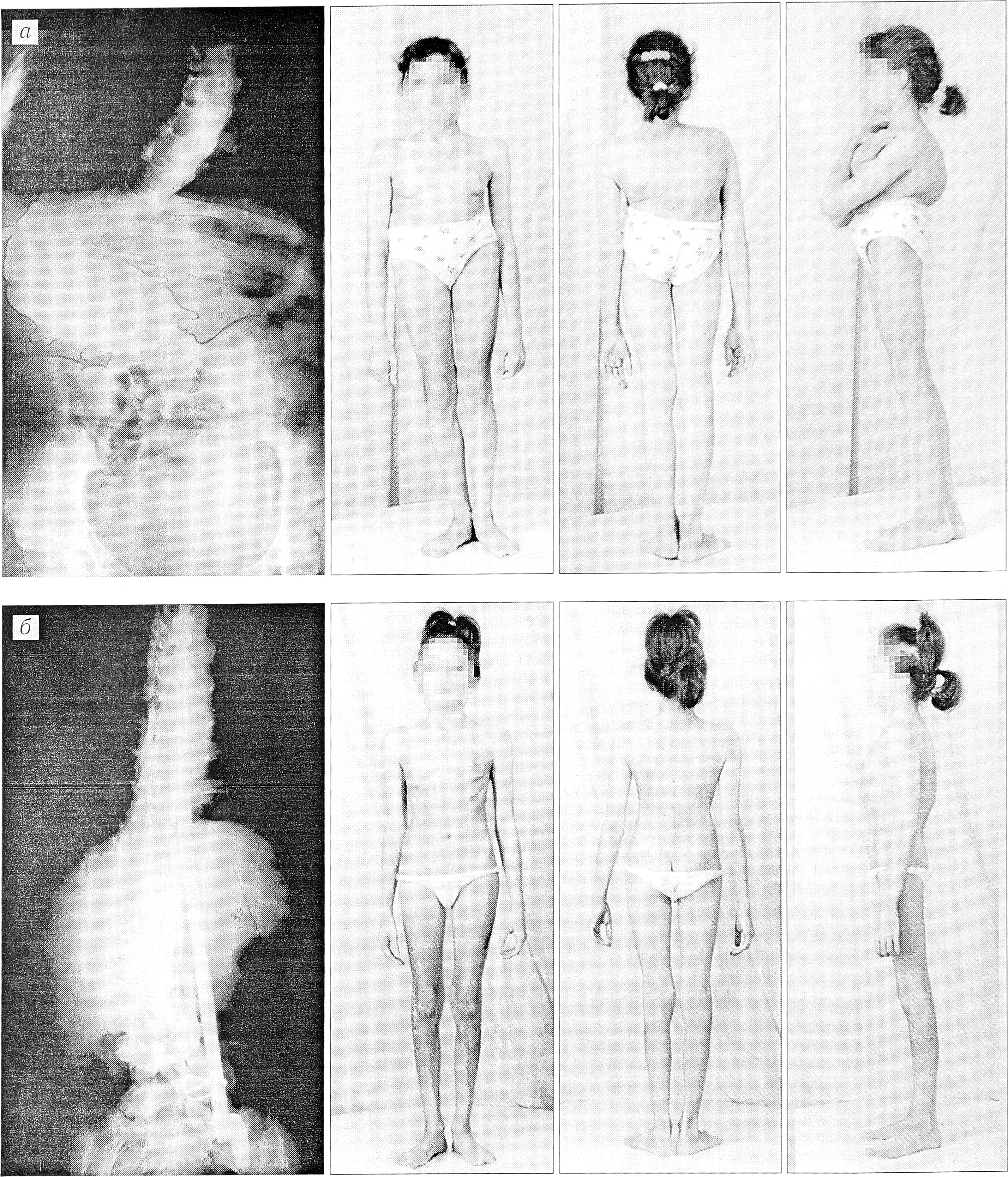 а — до операции; б — через 7 лет после оперативного лечения (коррекция кифосколиоза динамическим эндокорректором с последующей заменой его на дистрактор Харрингтона).
