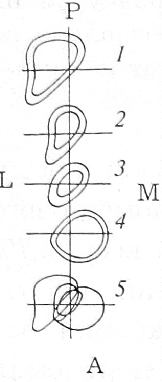 Было исследовано 30 большеберцовых костей лиц мужского пола, скоропостижно умерших в возрасте 30—43 лет. Изъятые кости подвергали рентгенографии в стандартных, а в ряде случаев — в специальных проекциях и разрезали ножовочным полотном перпендикулярно анатомической оси на разных уровнях. Выполнено 300 сечений, получено 330 образцов. После прокрашивания их торцов наносили отпечатки на миллиметровую бумагу. На стандартных рентгенограммах маркировали контуры костномозгового канала, отмечали границы суженного участка (истмуса). Посередине и параллельно стенкам истмуса строили истмальную ось. Относительно нее определяли координаты поперечных сечений. Соответственно найденным координатам контуры сечений изображали в плоскости, перпендикулярной истмальной оси (рис. 1). Это дало возможность исследовать соотношение поперечных сечений не только во фронтальной и сагиттальной плоскостях, выявленное на стандартных рентгенограммах, но и в любой другой плоскости, параллельной истмальной оси, путем проекционного изображения (рис. 2).