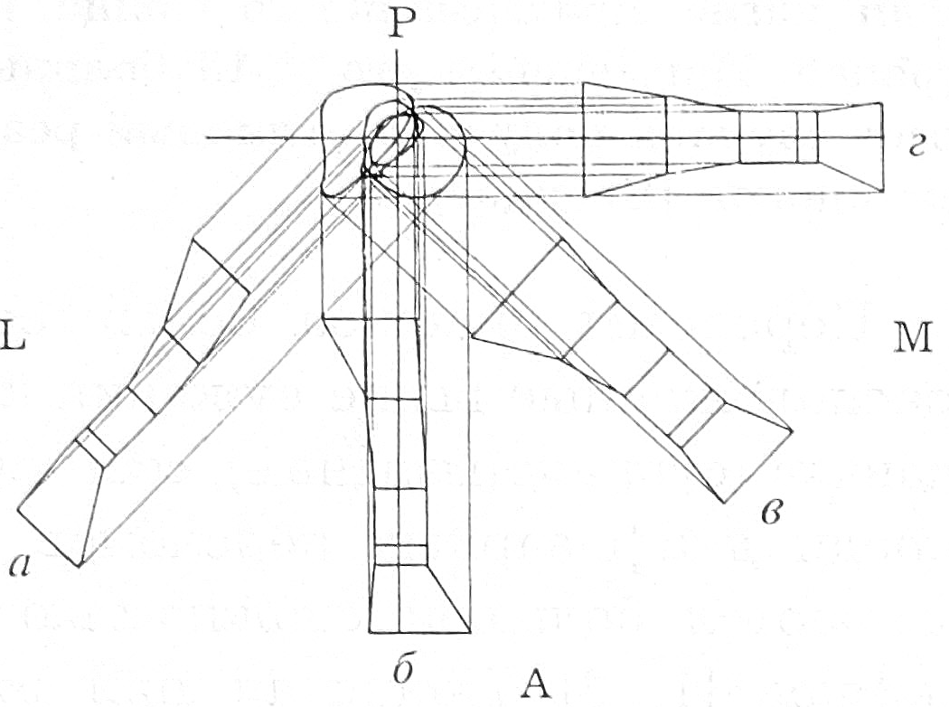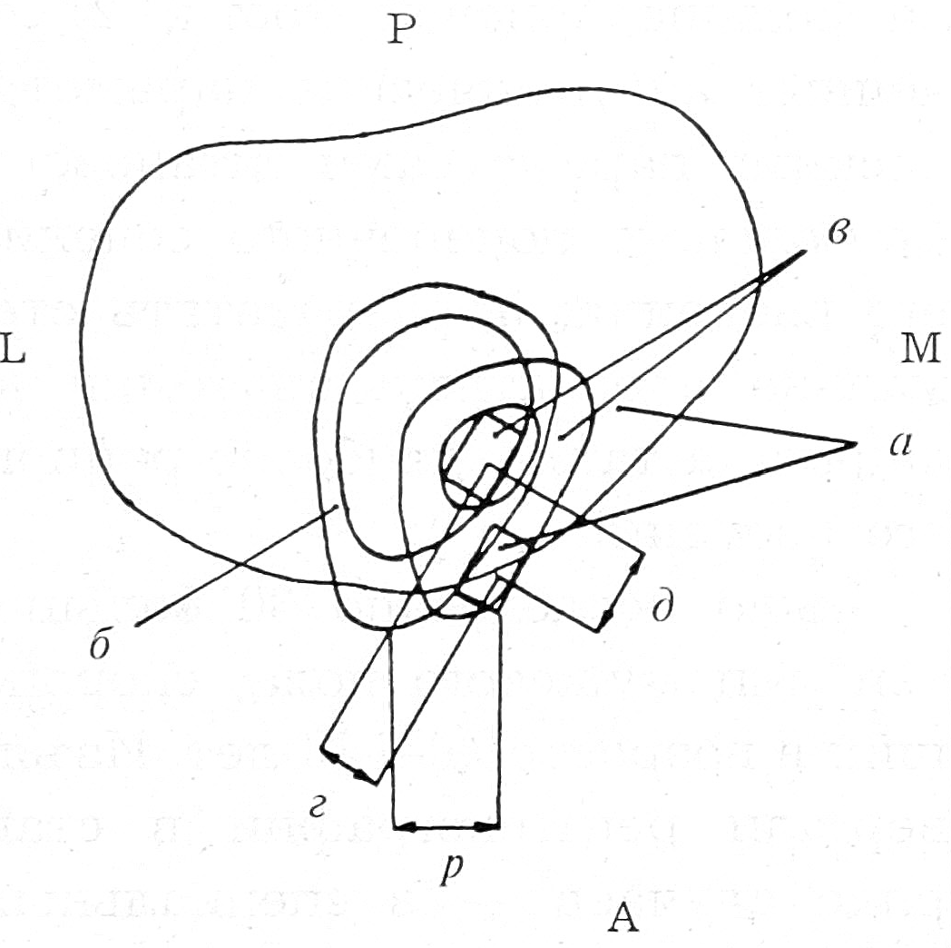 Рис. 4. Схема взаимного расположения поперечных сечений большеберцовой кости и модифицированного стержня: a — поперечное сечение кости и стержня на уровне его введения; б — поперечное сечение на уровне бугристости; в — поперечное сечение кости и стержня на уровне истмальной части канала; г — величина отгиба проксимального конца стержня в сторону широких граней; д — величина отгиба в сторону узких граней; р — расстояние между местом введения стержня и бугристостью.