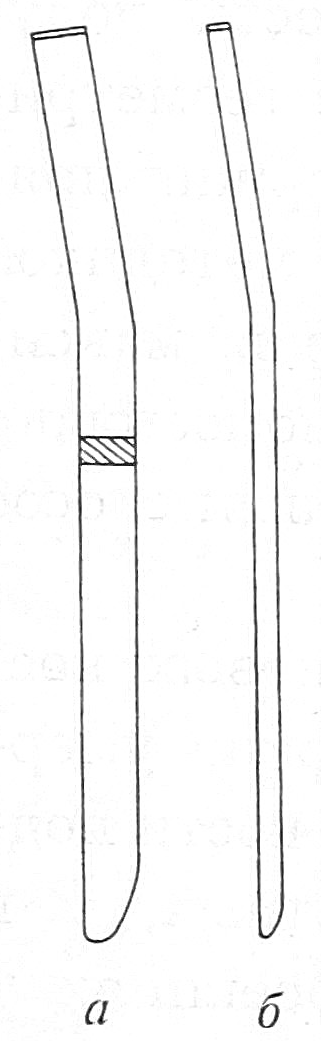 Необходимость соблюдения указанных положений потребовала внесения изменений в форму конструкции (заявка на изобретение № 95121002) и методику операции при супраистмальных переломах большеберцовой кости. Модифицированный стержень отличается наличием дополнительного изгиба проксимального конца в сторону узких граней (рис. 3). Благодаря такой форме при введении стержня медиальнее и выше бугристости большеберцовой кости его проксимальный конец оказывается расположенным точно по продолжению оси истмальной части канала во фронтальной плоскости, а плоскость широких граней стержня ориентируется параллельно медиальной грани большеберцовой кости (рис. 4).
