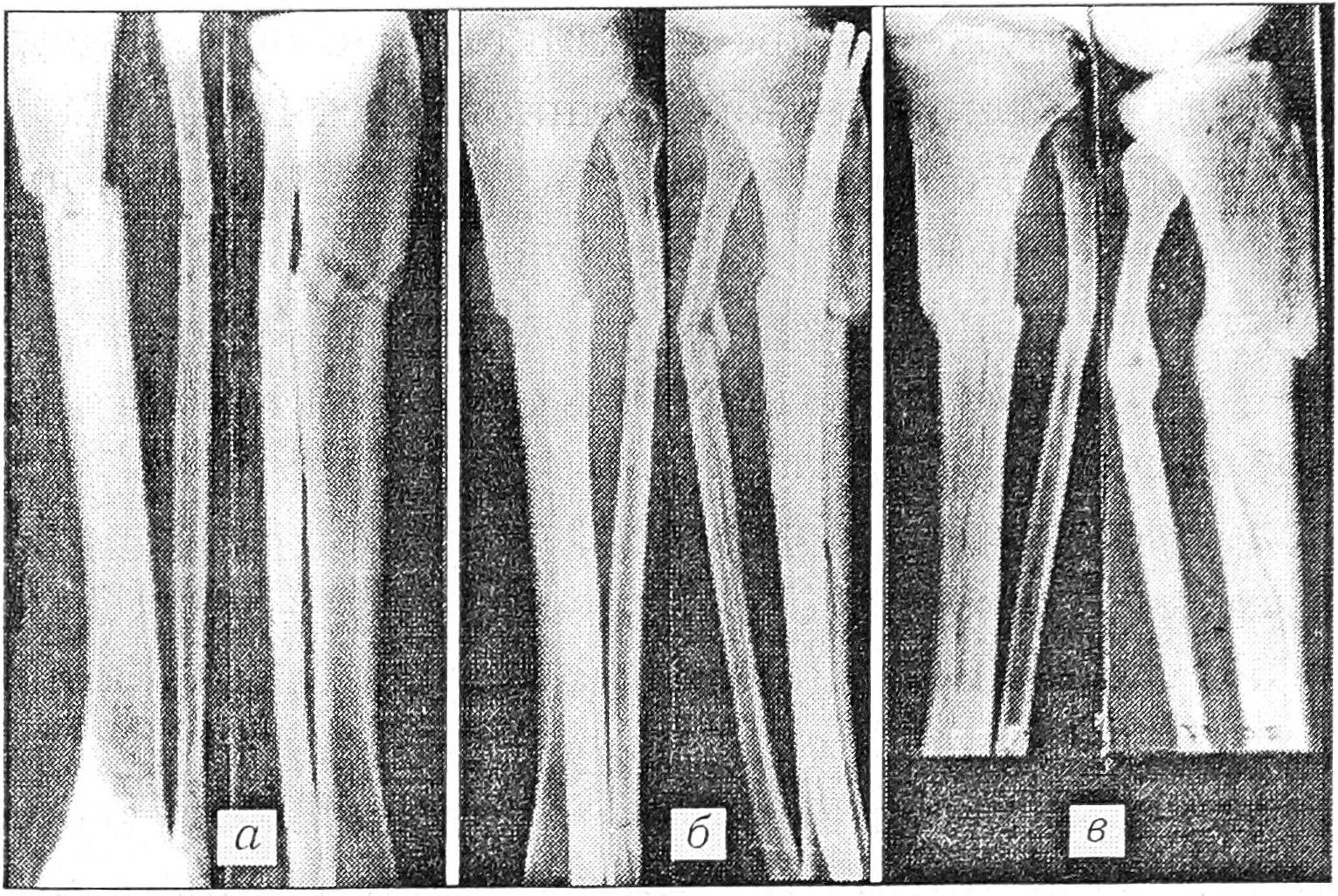 Рис. 5. Рентгенограммы больного В.: а — до операции; б — после операции; в — после сращения отломков и удаления стержней.