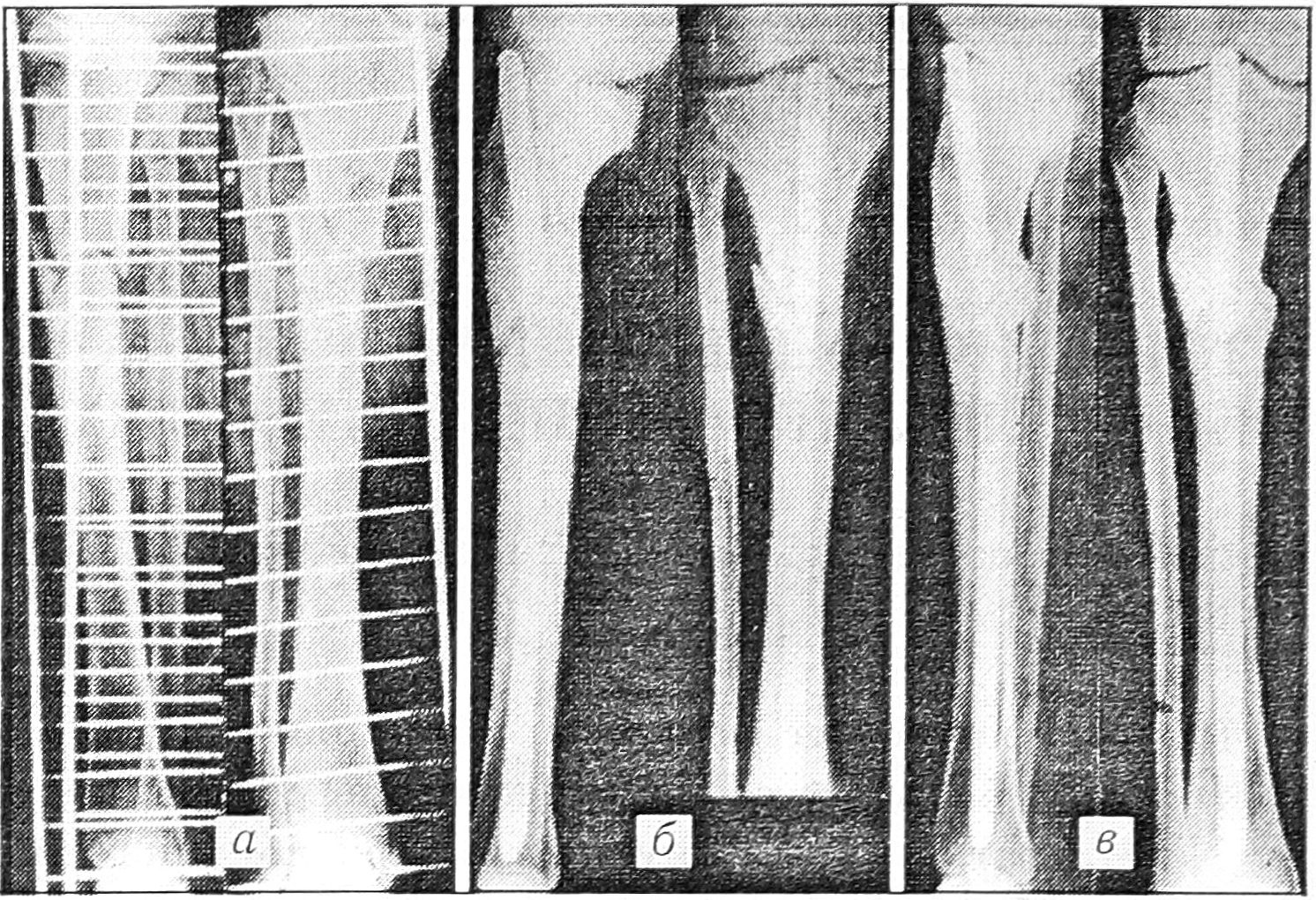 Рис. 6. Рентгенограммы больной М.: a — до операции; б — после операции; в — после сращения отломков.
