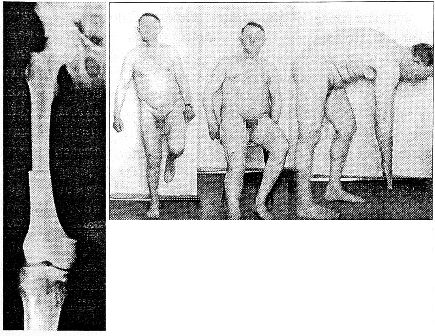 Рис. 1. Рентгенограмма больного П. после тотального удаления бедренной кости с замещением дефекта консервированным аллотрансплантатом и функция оперированной ноги.
