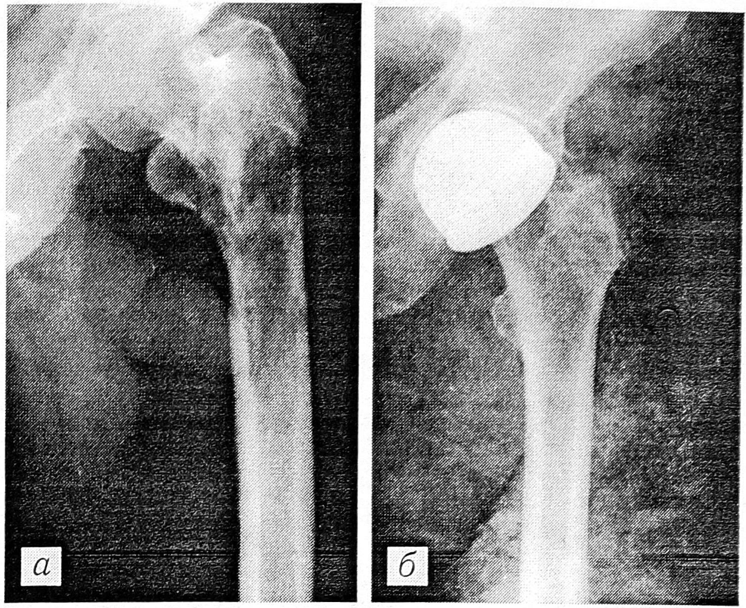 Рис. 2. Рентгенограммы больного У.: a — до операции; б — после тотального удаления бедренной кости и замещения дефекта консервированным аллотрансплантатом (трансплантат не соответствует по размеру удаленной бедренной кости, на головку бедра надет металлический колпачок).