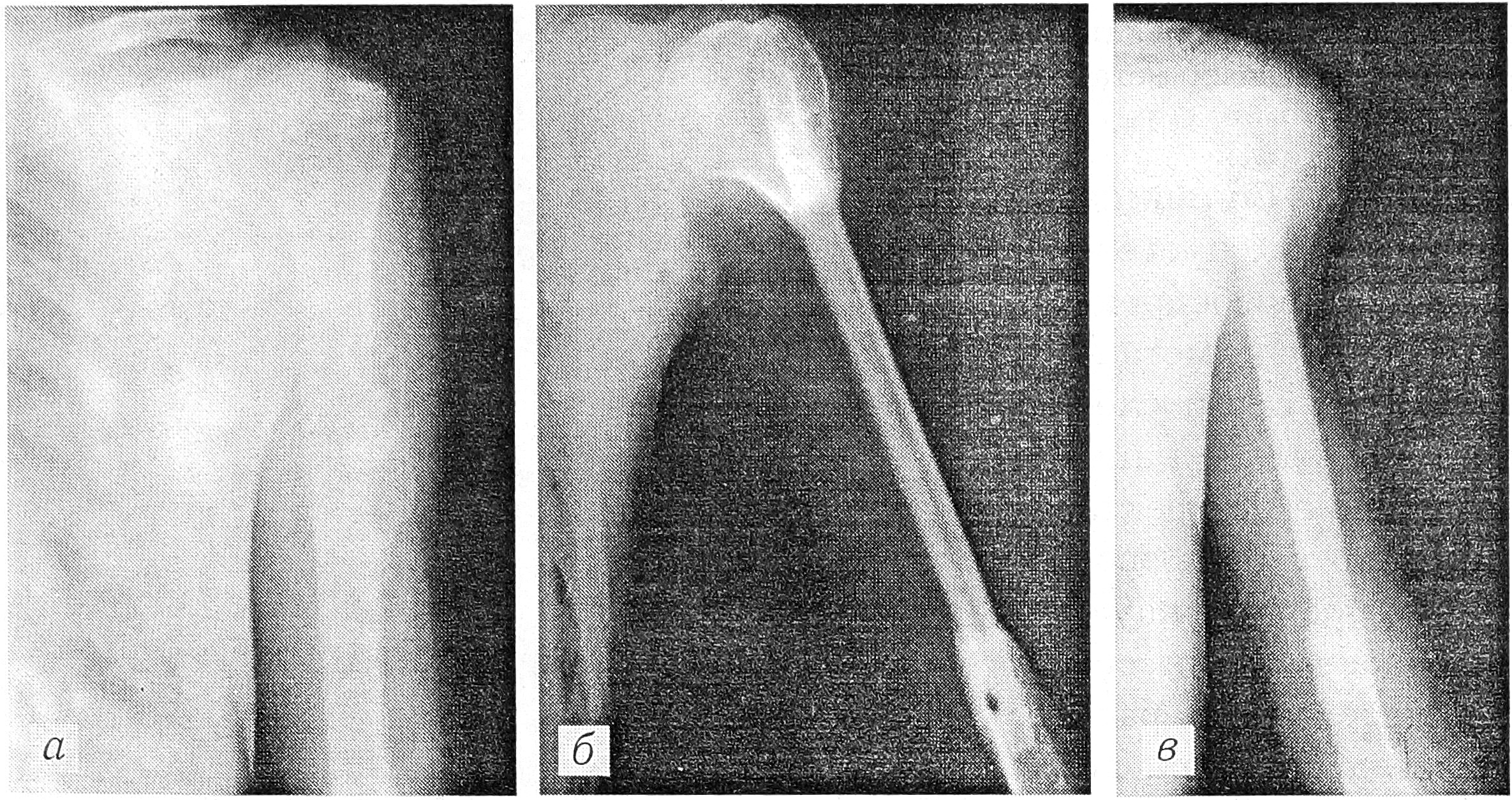 Рис. 3. Больной Ш.: a — рентгенограмма до операции; б — через 3 мес после резекции диафиза плечевой кости с замещением дефекта аутотрансплантатом на микрососудистых анастомозах; в — через 2 года после операции (видна гипертрофия аутотрансплантата); г -— функция руки через 2 года после операции.