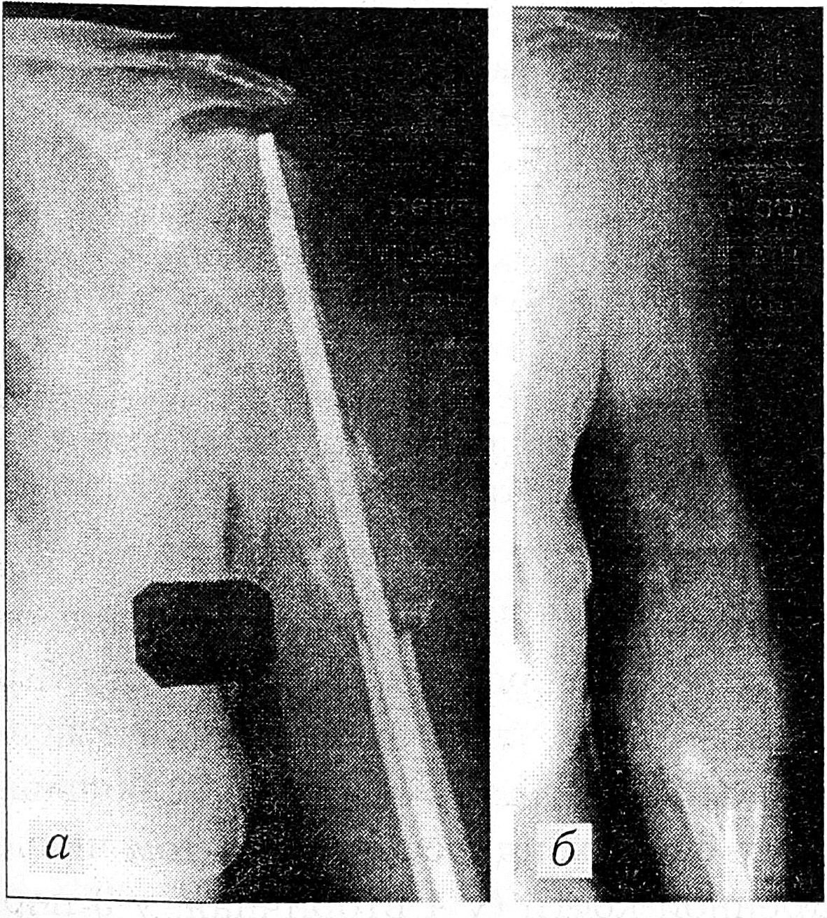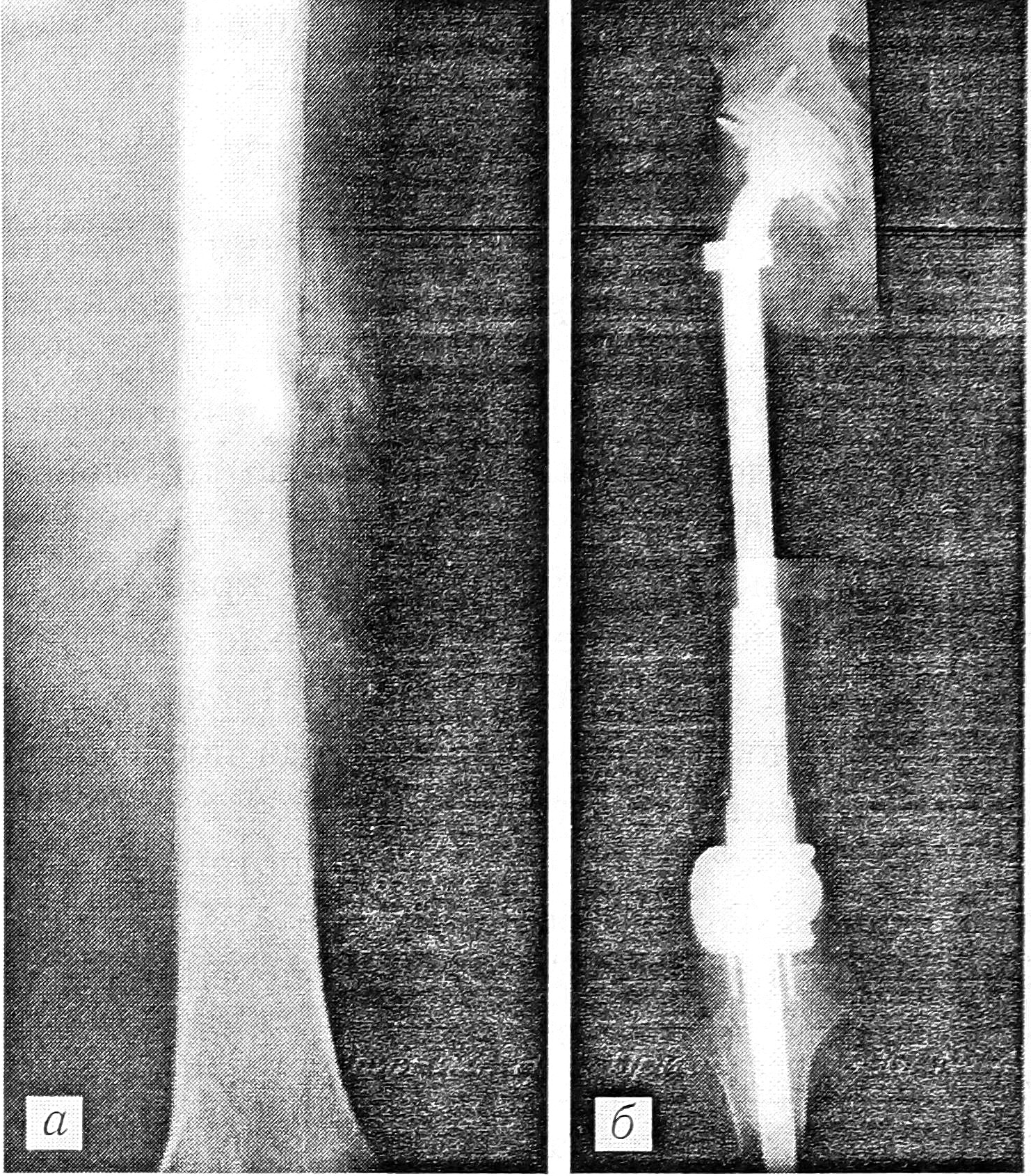 Рис. 5. Рентгенограммы больного Т.: а — до операции; б — после тотального удаления бедренной кости с эндопротезированием дефекта протезом-комплексом Сиваша.