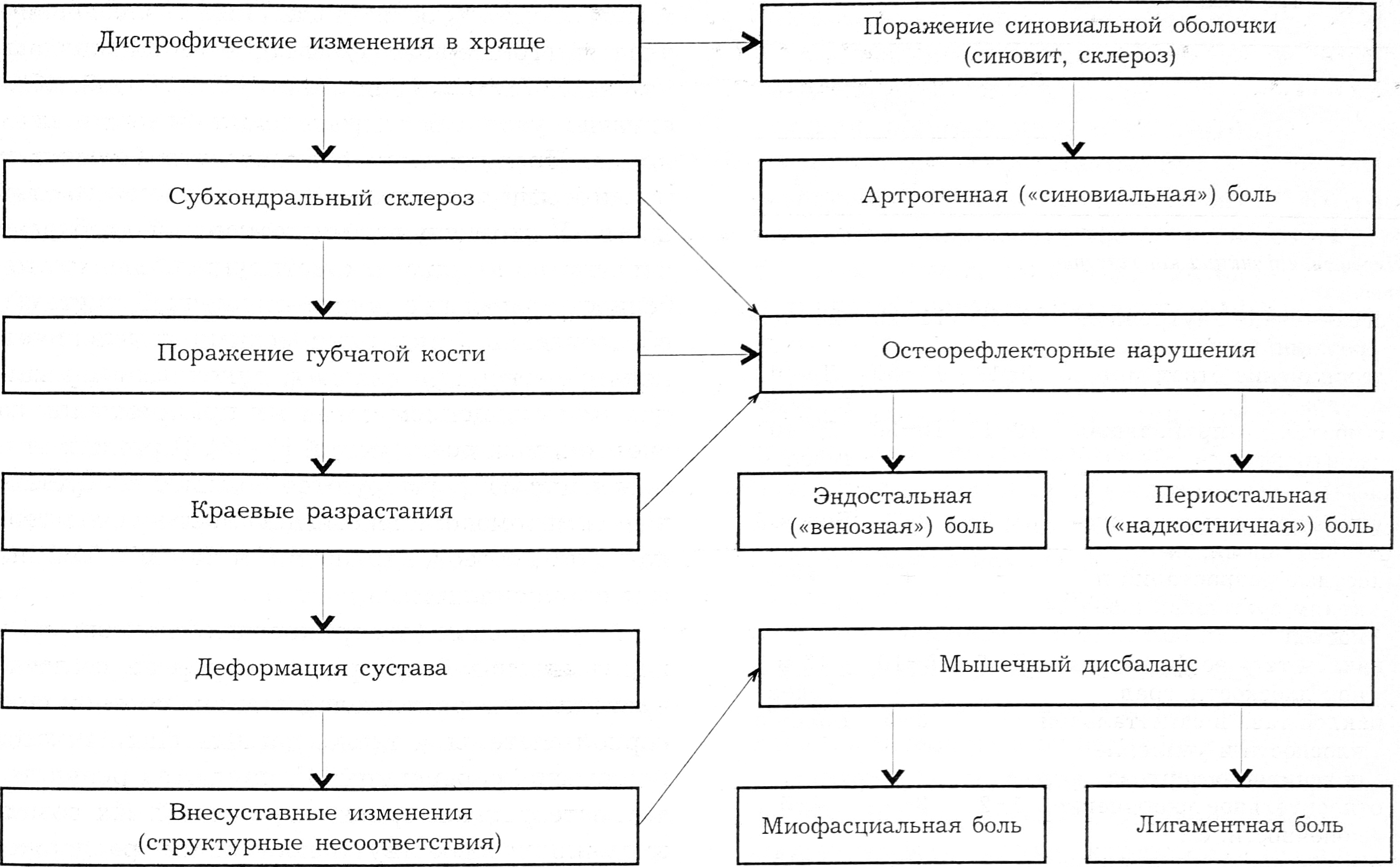 Рис. 1. Схема патогенеза болевого синдрома при деформирующем остеоартрозе.