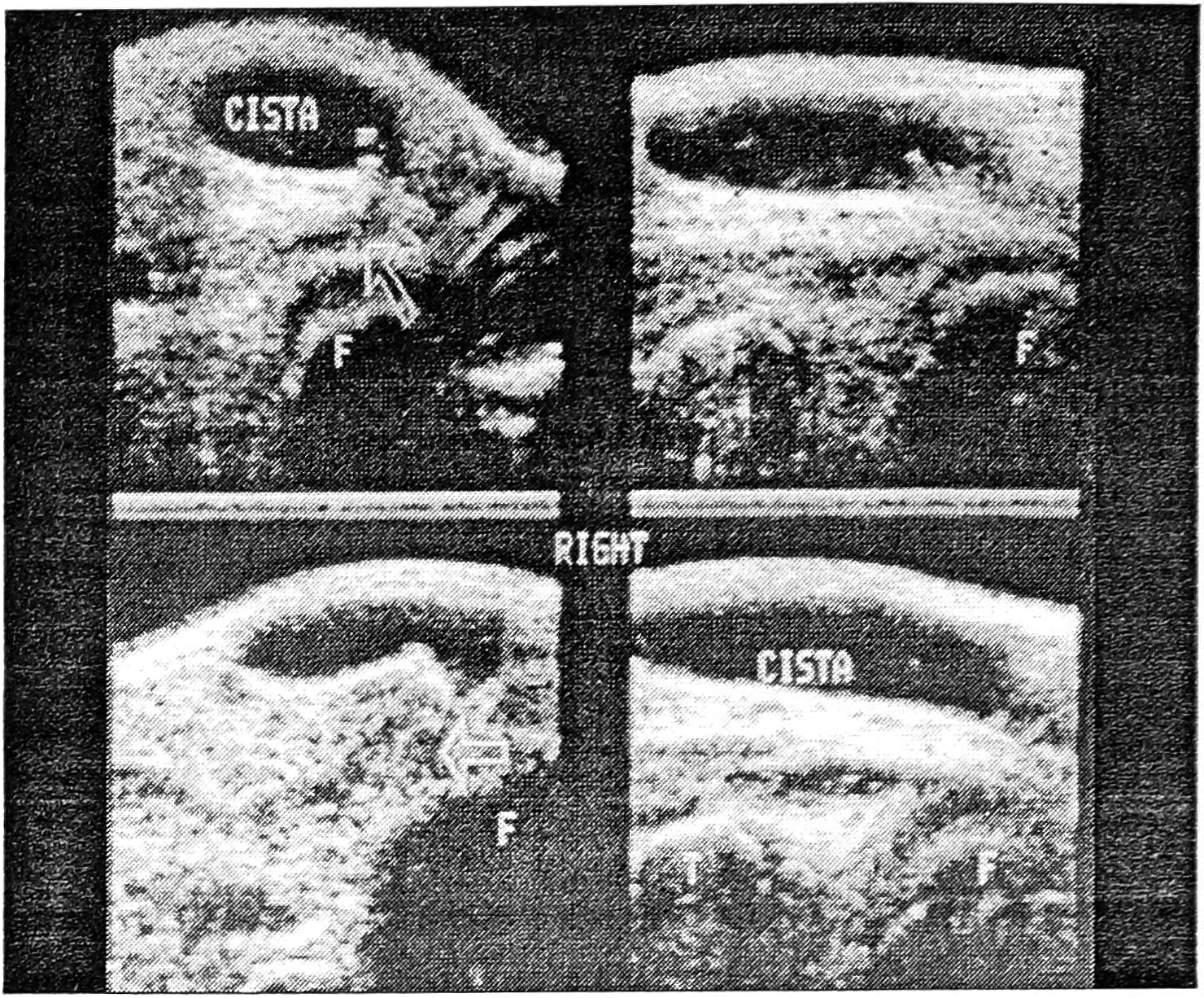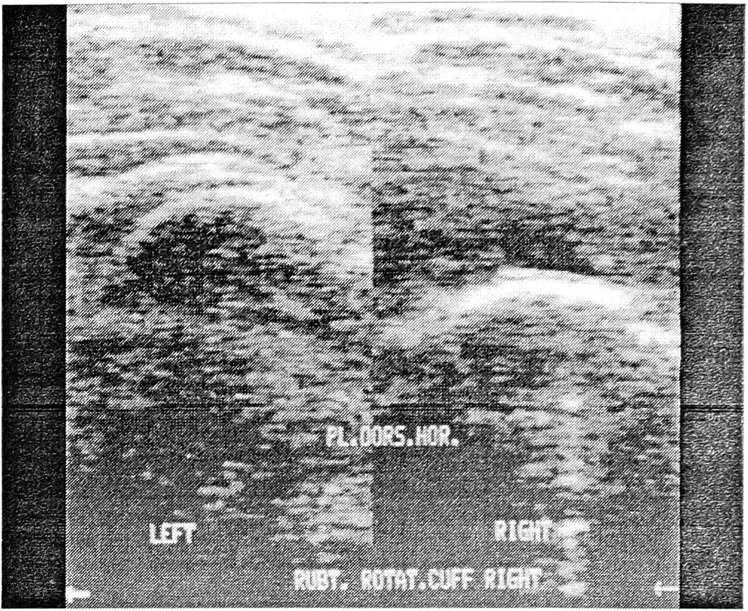 Сонограмма сухожилия двуглавой мышцы (вентральная горизонтальная проекция) представляет собой эхогенный эллипс. При разрыве его визуализируется пустая борозда, при подвывихе — аномальное расположение сухожилия в борозде, при тендините — выпот в синовиальное влагалище, при сухожильном отеке — нерегулярность структуры.