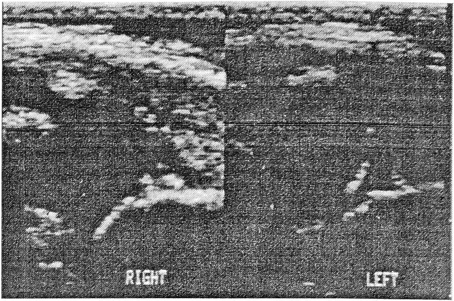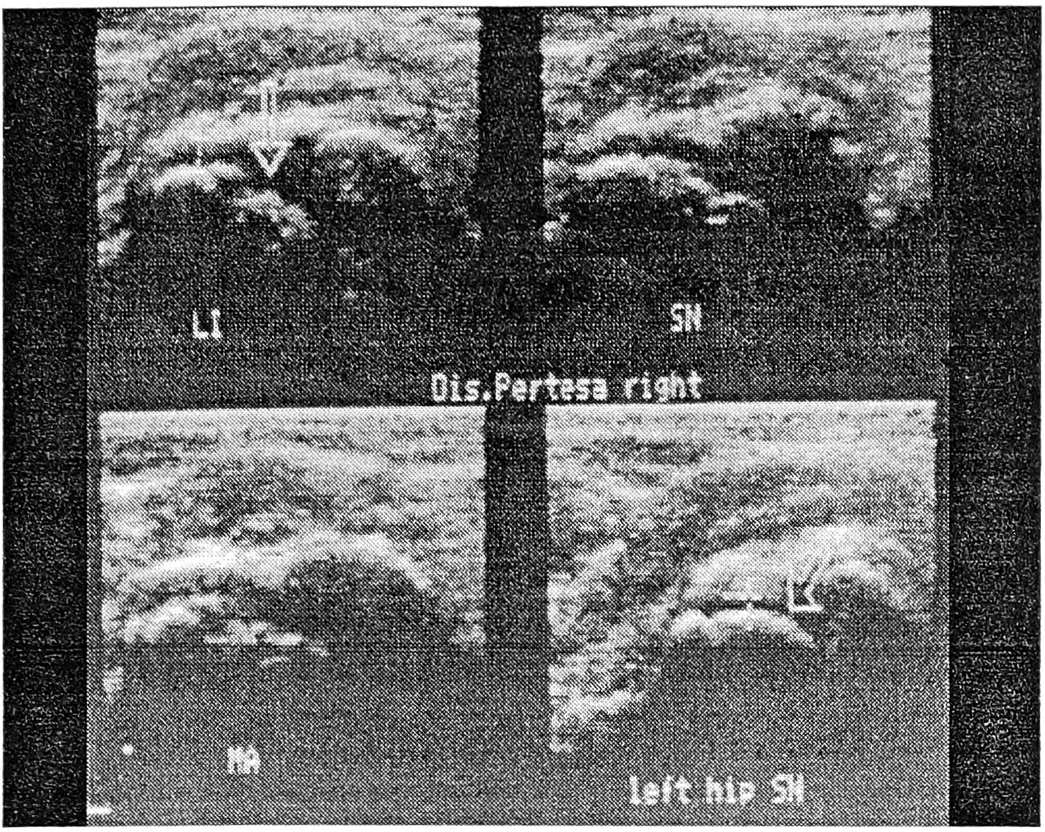 Рис. 2. Тазобедренные суставы младенца: состояние головки справа III типа (подвывих), слева — IV типа (вывих).