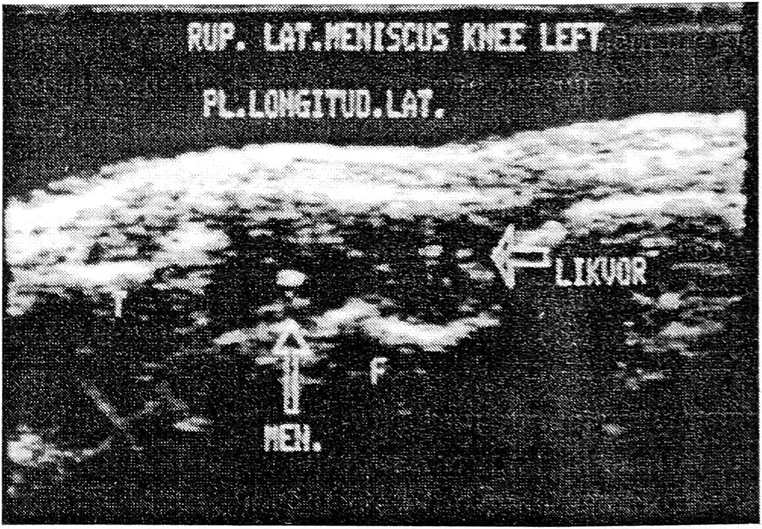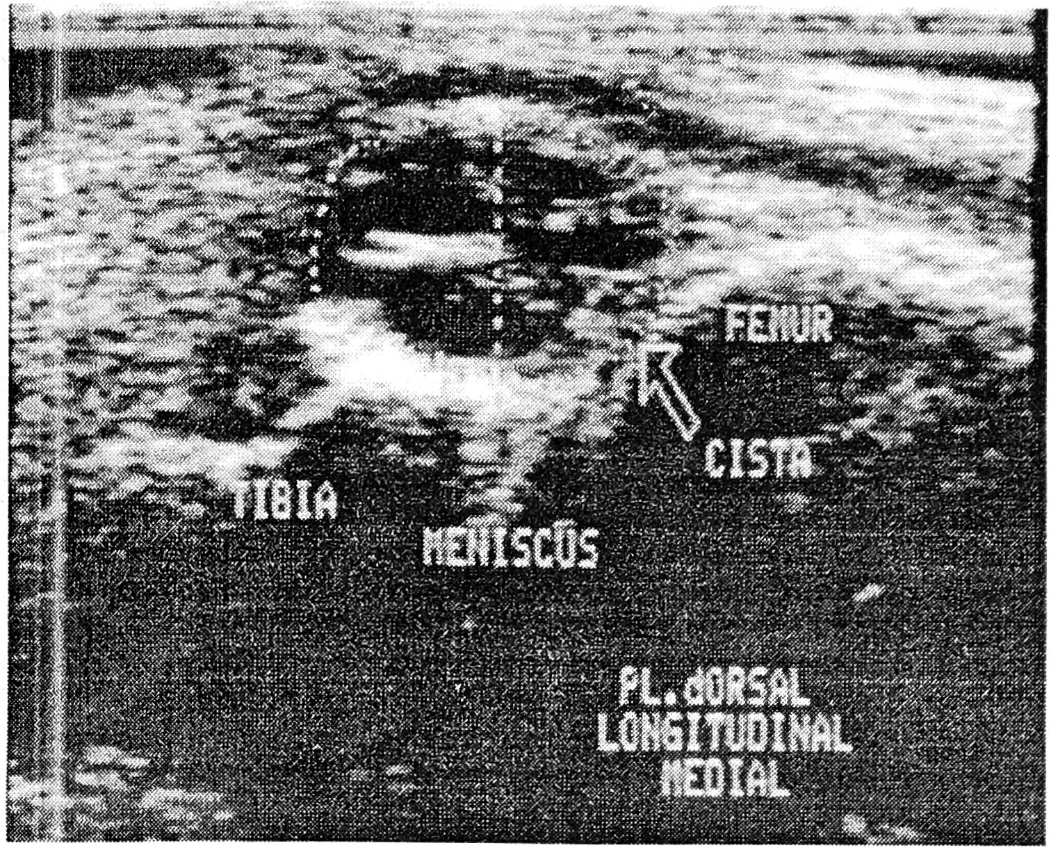 1) линейная структура повышенной эхогенности между суставными поверхностями бедренной и большеберцовой костей, соответствующая неполному разрыву мениска;