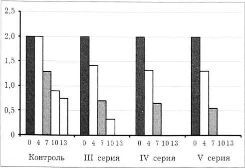 На 13-е сутки в контрольной серии раны оставались у 4 животных (0,75±0,3 см2), а в III серии — только у одного (0,2 см2).