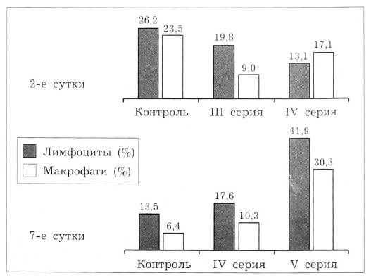 У животных V серии на 7-й день наблюдения выявлено значительное уменьшение количества нейтрофилов (27,8%) и увеличение количества лимфоцитов и макрофагов (см. рис. 2).