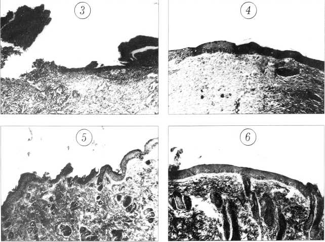 На 15-е сутки эксперимента животные II-V серий были выведены из опыта для морфологического исследования зоны ранений. Выявлено, что в контрольной серии эта зона покрыта фибринозно-лейкоцитарным экссудатом и представлена тонким слоем фибробластов со слабо выраженной пролиферацией эпидермиса (рис. 3). В III серии опытов эпителий зоны ранений был дифференцирован на слои (рис. 4). У животных, подвергнутых комбинированному воздействию (IV серия), при наличии дифференцированного эпителия в дерме определялись волосяные фолликулы (рис. 5). Наиболее выраженная дифференцировка отмечена в V серии опытов: эпителий имел роговой слой, а в подлежащей дерме находились сформированные волосяные фолликулы (рис. 6).