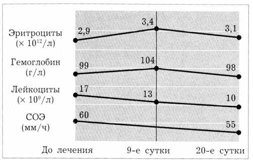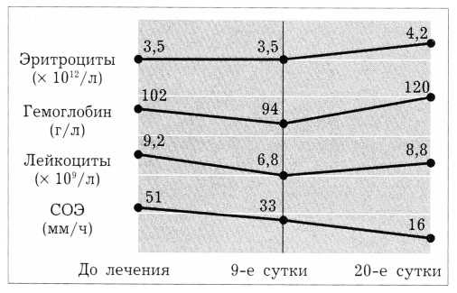 Положительная клиническая динамика сопровождалась улучшением картины крови по данным лабораторных исследований у всех пациентов, причем у больных 3-й группы уменьшение анемии, лейкоцитоза и снижение скорости оседания эритроцитов были наиболее выраженными (рис. 7, 8).
