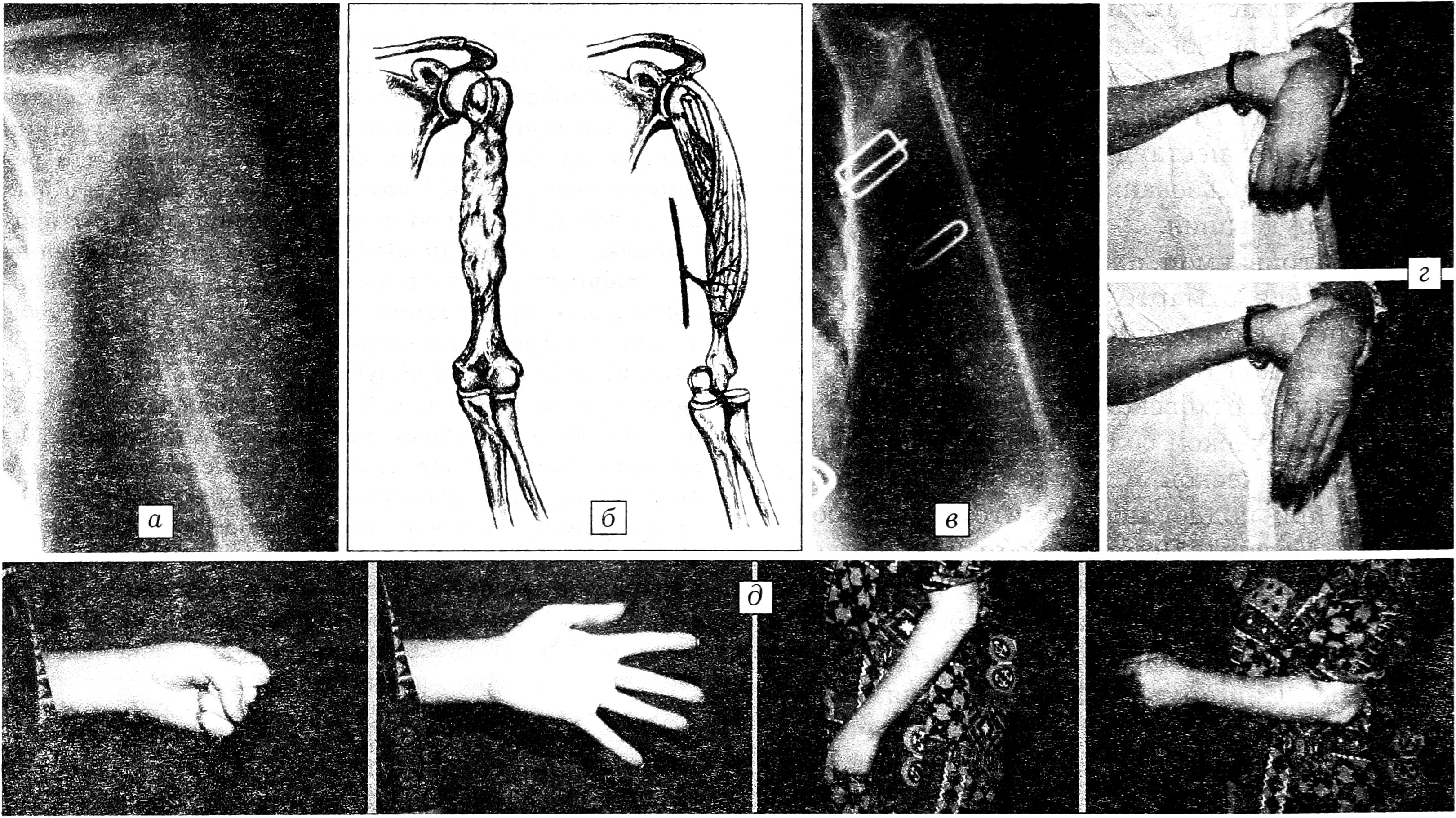 a — рентгенограмма левой плечевой кости до операции; б — схема пластики дефекта; в — рентгенограмма после операции; г — функция левой кисти через 1 мес после операции; д — функция левой кисти и локтевого сустава через 1,5 года после операции.
