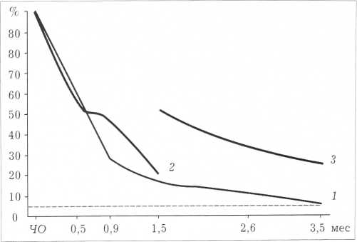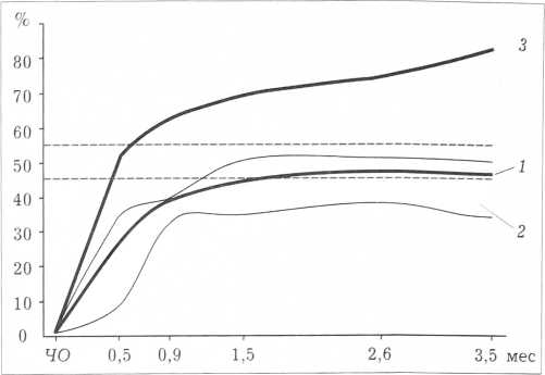 Рис. 3. Динамика асимметрии опорности нижних конечностей при стоянии (1) и ходьбе с помощью костылей (2) и без костылей (3). Пунктиром указана граница функциональной асимметрии. По оси абсцисс — продолжительность периода фиксации (в мес), ЧО — чрескостный остеосинтез; по оси ординат — асимметрия опорности нижних конечностей (в %).