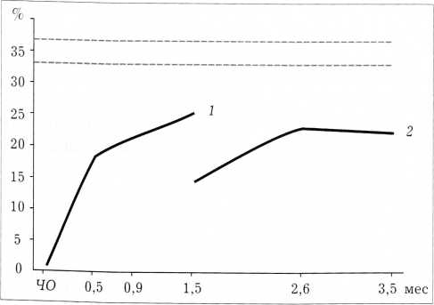 Рис. 2. Динамика продолжительности одноопорного периода шага оперированной конечности при передвижении больных с помощью костылей (1) и без костылей (2). Пунктиром указаны границы нормальных значений. По оси абсцисс — продолжительность периода фиксации (в мес), ЧО — чрескостный остеосинтез; по оси ординат — продолжительность периодов опоры (в %).